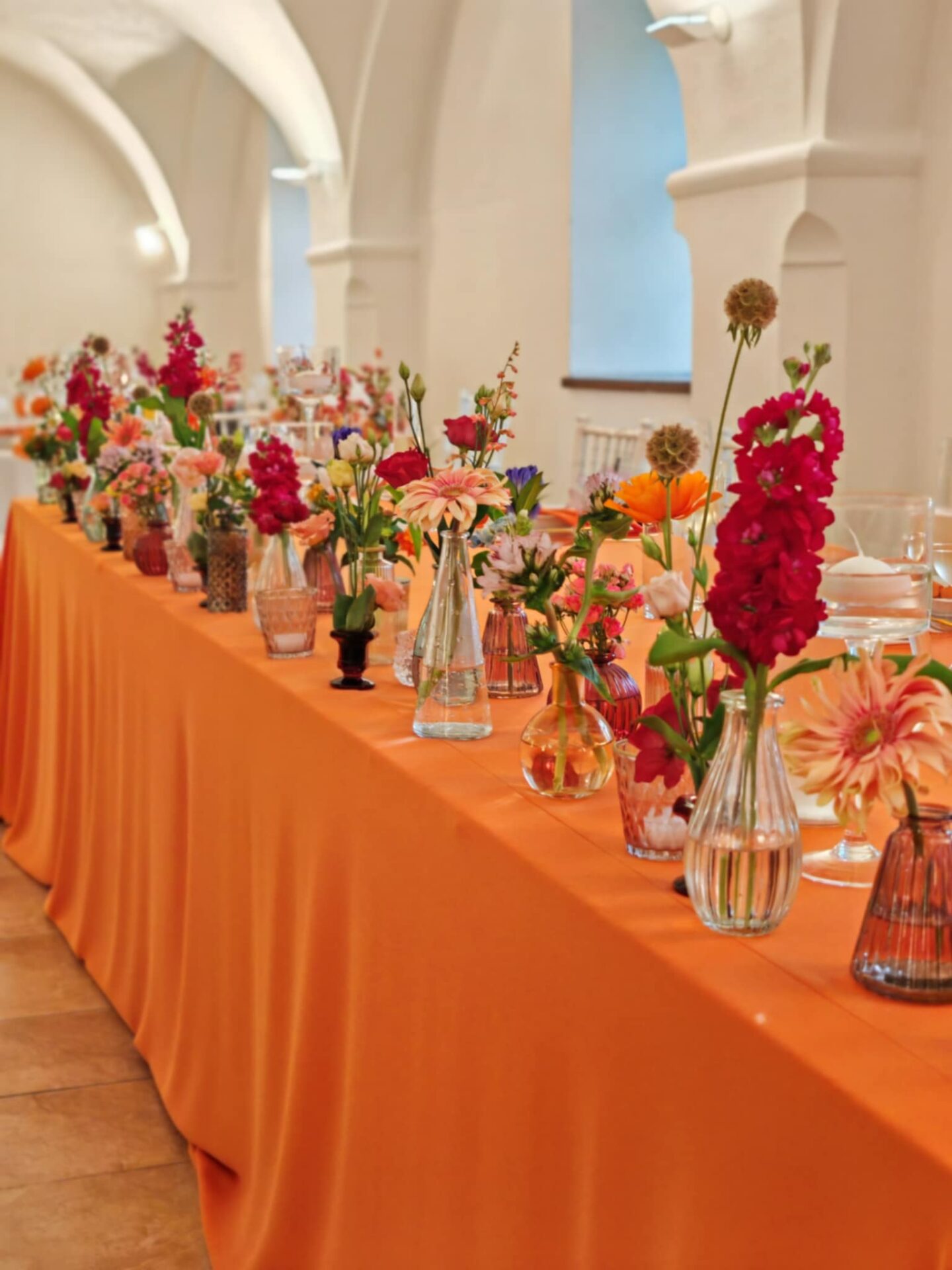 Oranžový hranatý obrus na hlavný stôl o priemere 6m x 2,25m